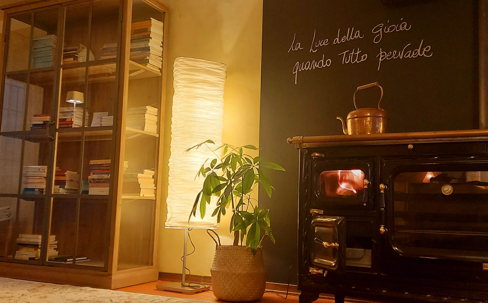 Il calore della stufa, il morbido sostegno delle poltrone colorate, i libri da consultare, uno spazio per poter stare seduti a terra, sdraiati o per muovere il corpo.